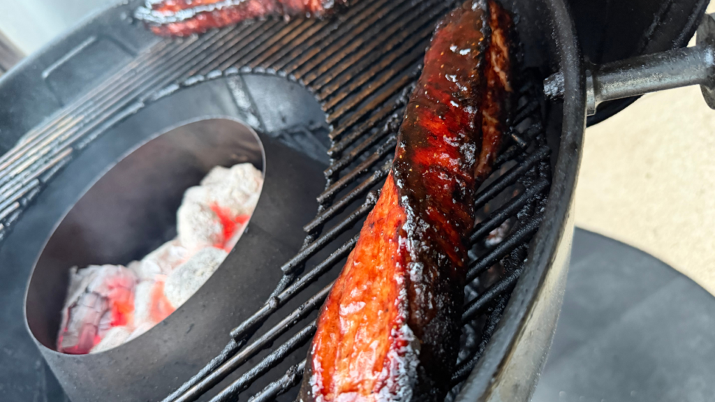 5. Place the pork around the perimeter of the grill. Cook for 50-60 minutes, ensuring you rotate the lid 1/3 turn every 10 minutes to prevent hot spots.