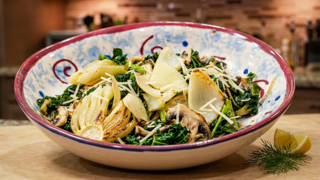 Greek Sautéed Fennel, Kale and Mushrooms! An amazing side dish idea for Thanksgiving! This Greek-inspired sautéed fennel, kale, and mushroom dish is a savory,, nutrient-dense side, often elevated with garlic, lemon, and Mediterranean herbs such as thyme or oregano. Sautéed in olive oil or butter until tender, it commonly features Kalamata olives, parmesan, and lemon juice for a bright, tangy finish.