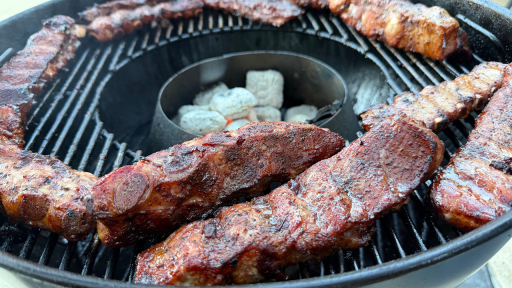 5. Spray the grates with cooking oil. then place the ribs onto the grates. For a better smoke flavor, place a chunk of cherry wood on top of the briquettes. Cook for 45 minutes, rotating the lid 1/3 of the way around each 15 minutes to prevent hot spots and uneven cooking.