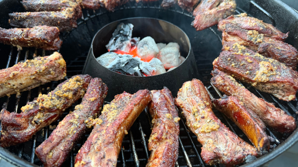 5. Spray the grates with cooking oil. then place the ribs onto the grates. Cook for 45 minutes, rotating the lid 1/3 of the way around each 15 minutes to prevent hot spots and uneven cooking.