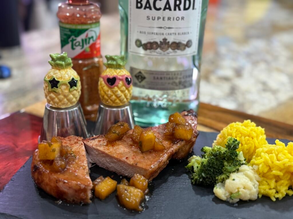 Grilled Pork Chops with Pineapple Rum Sauce. How could you possibly go wrong with a title like that? To make this masterpiece, we started with bone-in duroc pork chops. After soaking those glorious hunks of meat in a homemade brine overnight, we made the pineapple rum sauce and grilled the chops on our Weber grill with a vortex insert. The results were amazing!